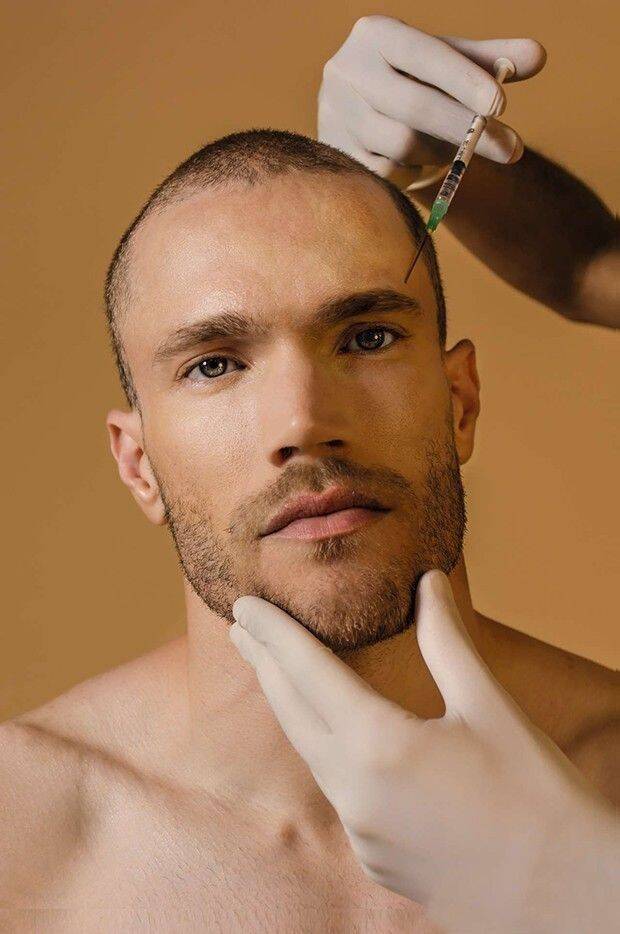 Una vez que todo está listo y se han verificado las pruebas previas al procedimiento, el paciente recibe inyecciones de PRP en el cuero cabelludo, seguidas de fototerapia con láser de baja intensidad (LLLT), que prepara el terreno para el siguiente paso.